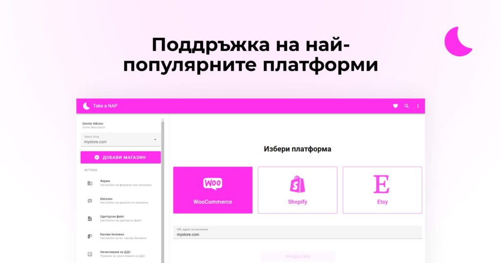 Ако използваш Take a NAP, третата стъпка е да свържеш магазина си с нашия софтуер. В момента официално поддържаните от нас платформи са Shopify и WooCommerce.