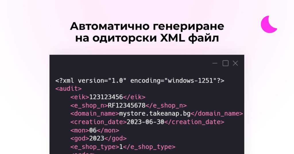 Одиторският XML файл е стандартизиран документ, който се генерира и подава електронно към НАП всеки месец. Той включва детайлна информация за всички транзакции, осъществени през съответния период, и помага на агенцията да проследи финансовата активност на твоя магазин.